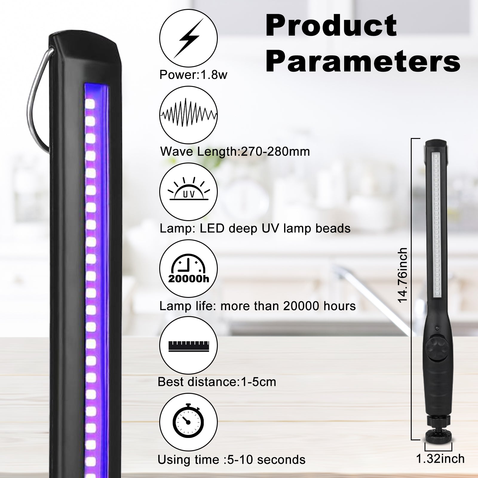 Wide-Area UV Illumination: High-brightness COB light with diffusion technology sterilizes large surfaces quickly and efficiently. The stepless dimmer allows precise control of disinfection intensity.